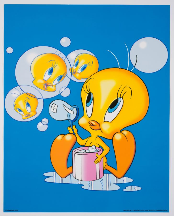 A limited edition poster from the Warner Bros. Studios. Featuring an illustration of Tweety bird blowing bubbles with himself in the reflections of the bubbles, the poster was printed in an edition of 1000 in Spain in 1998. Measuring 19.5"x15.75" overall, the poster is in very good condition with minor edge and general handling wear. Ships rolled.